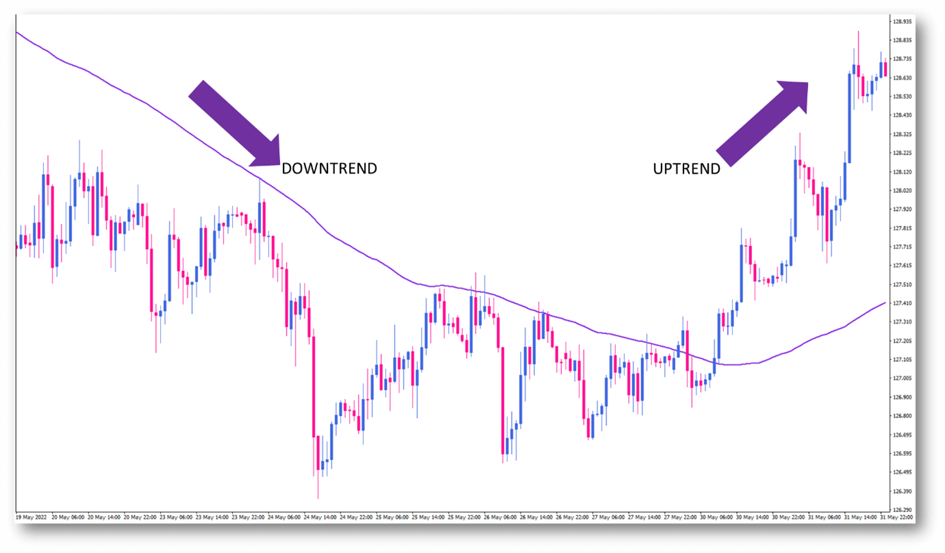 The most common approach in trading with moving averages assumes that an uptrend exists if the average slopes upward and the price is above it. In contrast, a downtrend would require the opposite conditions. A 200-period moving average is often used when determining the general direction of a trend using moving averages.