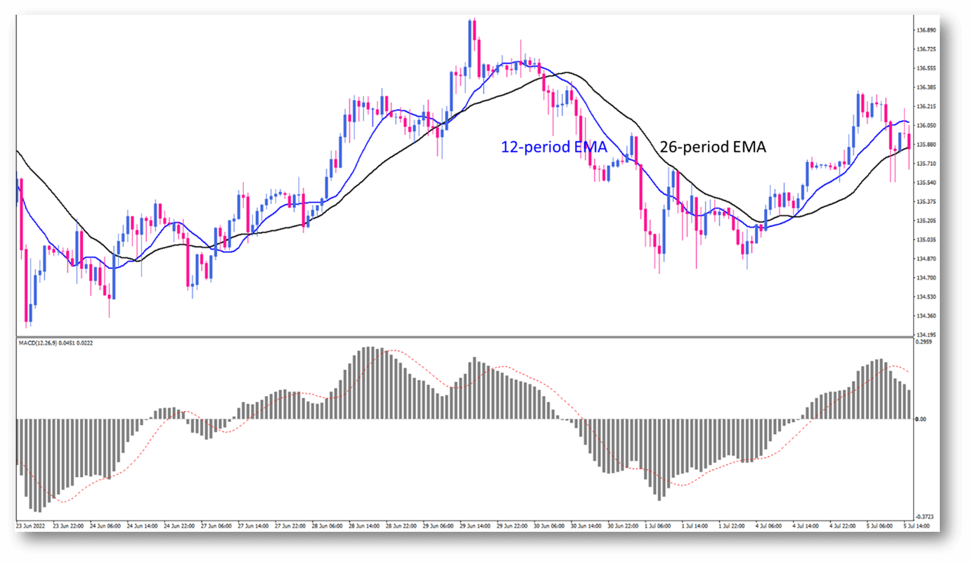 The MACD, or Moving Average Convergence Divergence, is a trend-following indicator that attempts to capture market momentum. It creates a momentum oscillator out of two exponential moving averages to accomplish this. Short-term momentum is assessed as being stronger or weaker compared to a long-term trend by subtracting the shorter moving average from the longer moving average.