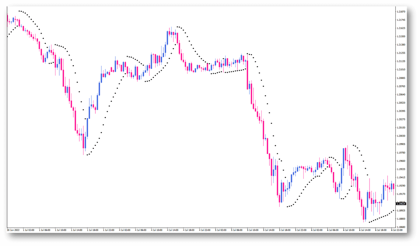 When it comes to the appearance of the parabolic SAR on a chart, it differs slightly from that of many other indicators. Unlike other indicators that show a line on or below the chart, the Parabolic SAR offers a series of dots. Generally, dots placed below the price are considered bullish signals, while dots above the price are considered bearish signals.