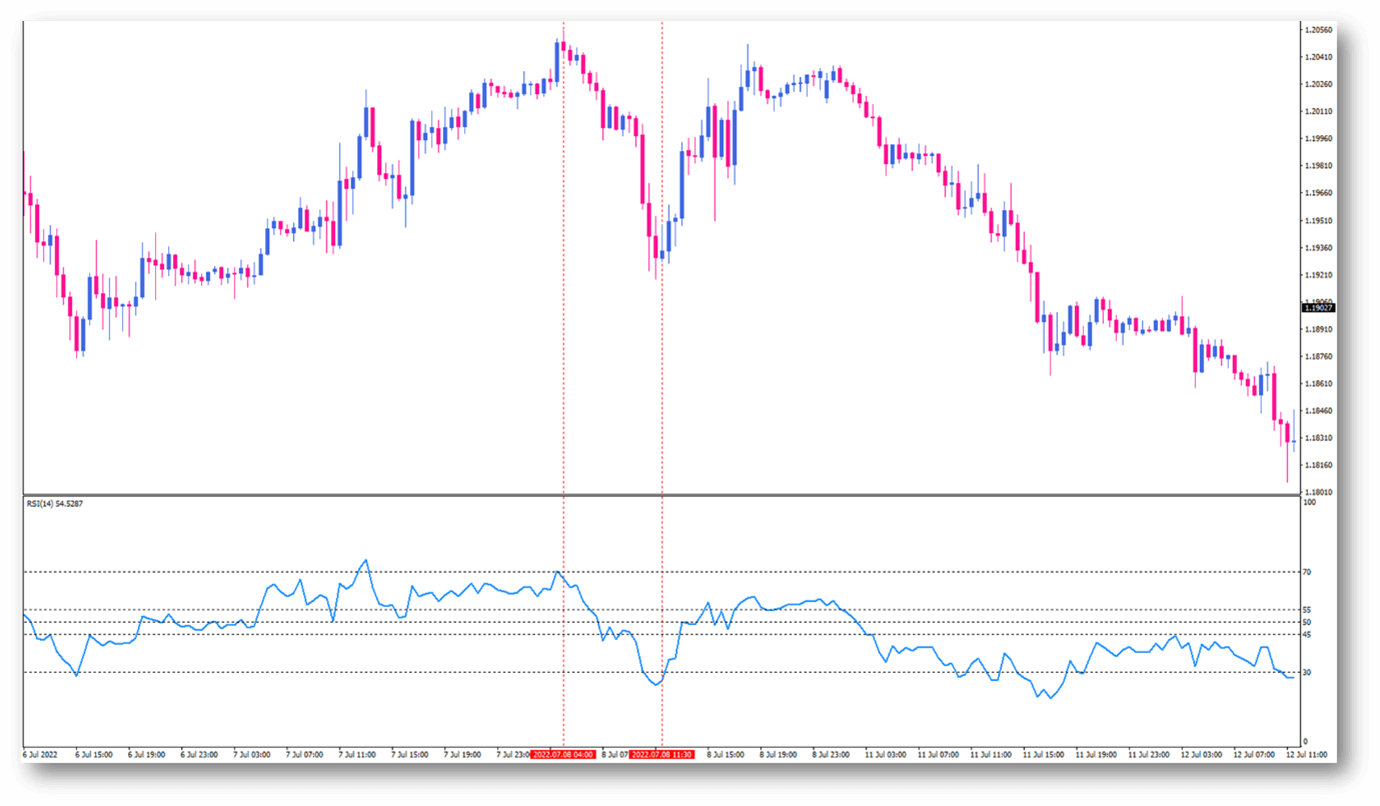 As soon as the RSI goes through a particular threshold value, many traders anticipate a reversal in the market. The market may reverse its move upside in the short term if the RSI falls below the 30-level, indicating exhaustion of sellers. Vice versa, if the RSI reading reaches the 70-level and beyond, that would be an indication of an overbought situation, hinting at a probable bearish reversal. However, that's not the only reason to use the RSI.